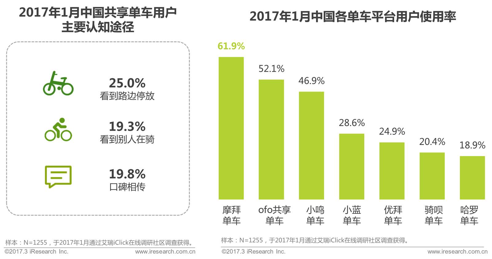 用户对于共享单车的认知多通过口碑相传以及看到在路上停放或被人骑行的共享单车,通过看到路边车辆的直观认知排名第一,占比25%;各共享单车平台中,使用摩拜单车的用户最多,为61.9%,其次为ofo共享单车,占比在52.1%。