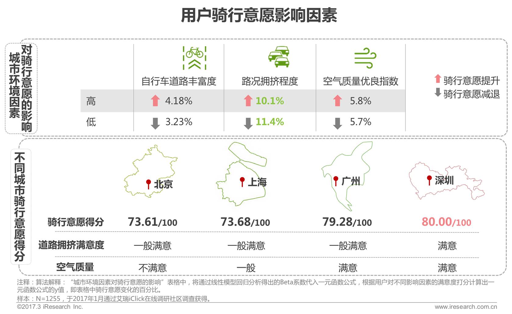 通过影响力模型分析,所在城市道路拥挤状况和空气质量是影响人们骑行意愿的主要因素,其中,路况拥挤程度对用户的骑行意愿影响最大,路况不佳时,用户更愿意使用共享单车以躲避交通拥堵,骑行意愿提升10.1%,而当道路通畅时,用户的骑行意愿则会降低11.4%;