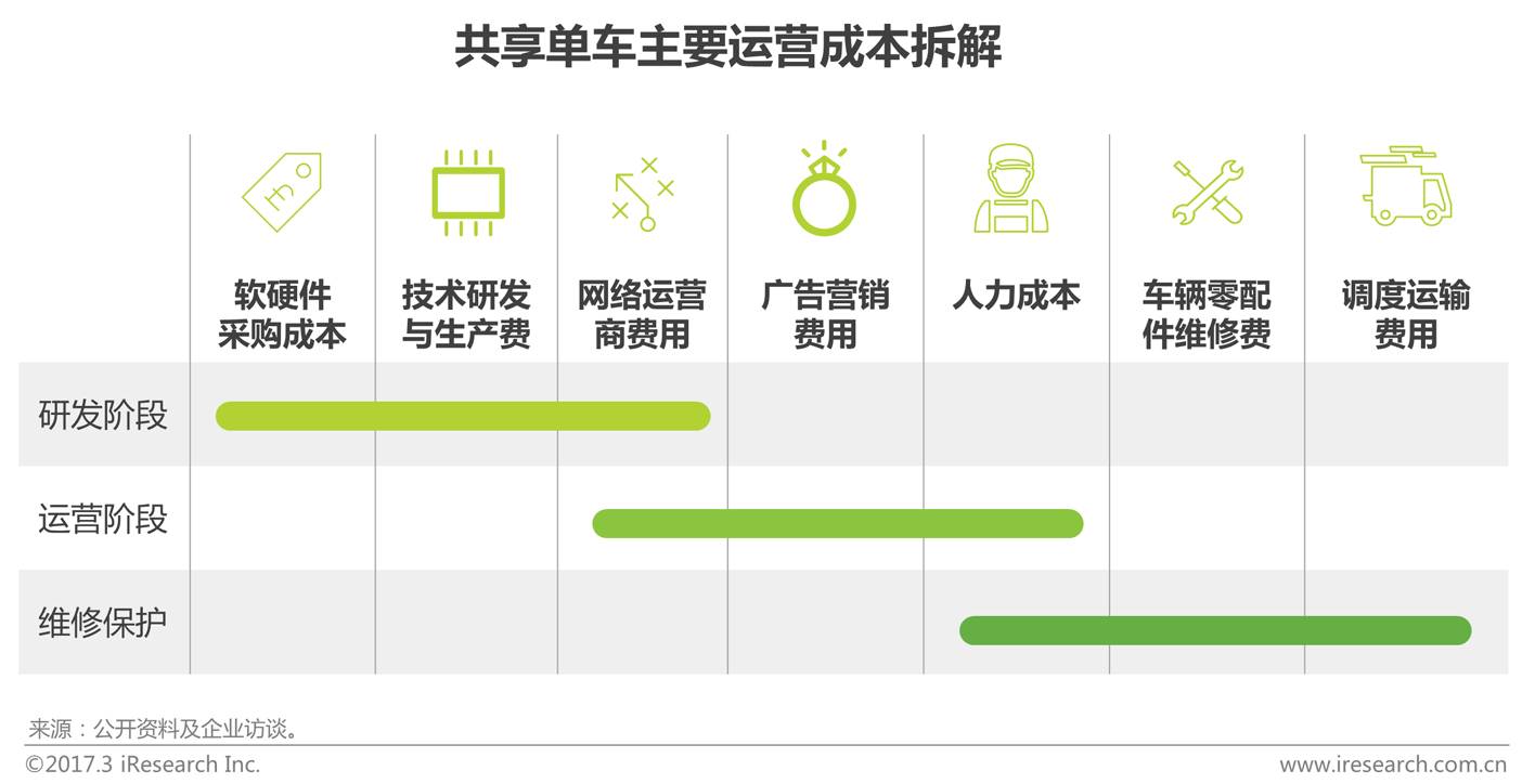 企业运营成本涉及多项维度,研发阶段成本主要为零配件采购、技术研发等费用;运营阶段中,由于车辆的开锁等模块会涉及到通信运营商,期间会随之产生网络费用;维修保护方面,目前各家企业主要通过大数据监管、人工调度车辆以及区域化分配维修师傅进行统一修缮,期间费用涉及零配件置换修理费、劳力成本、运输调度费等,除车辆制造成本以外,运维成本成为共享单车行业另一重要模块,而如何减少运维成本,提高运维效率需根据不同的车辆属性、造价等因素进行策略规划。