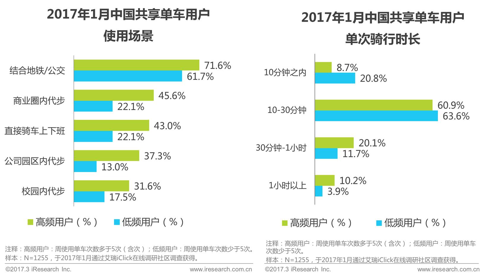 低频用户的使用场景较为单一,61.7%的用户出行场景集中在家/公司/商圈到地铁站/公交站间的往返,单次使用时间集中在30分钟以内,占比达到84.4%;