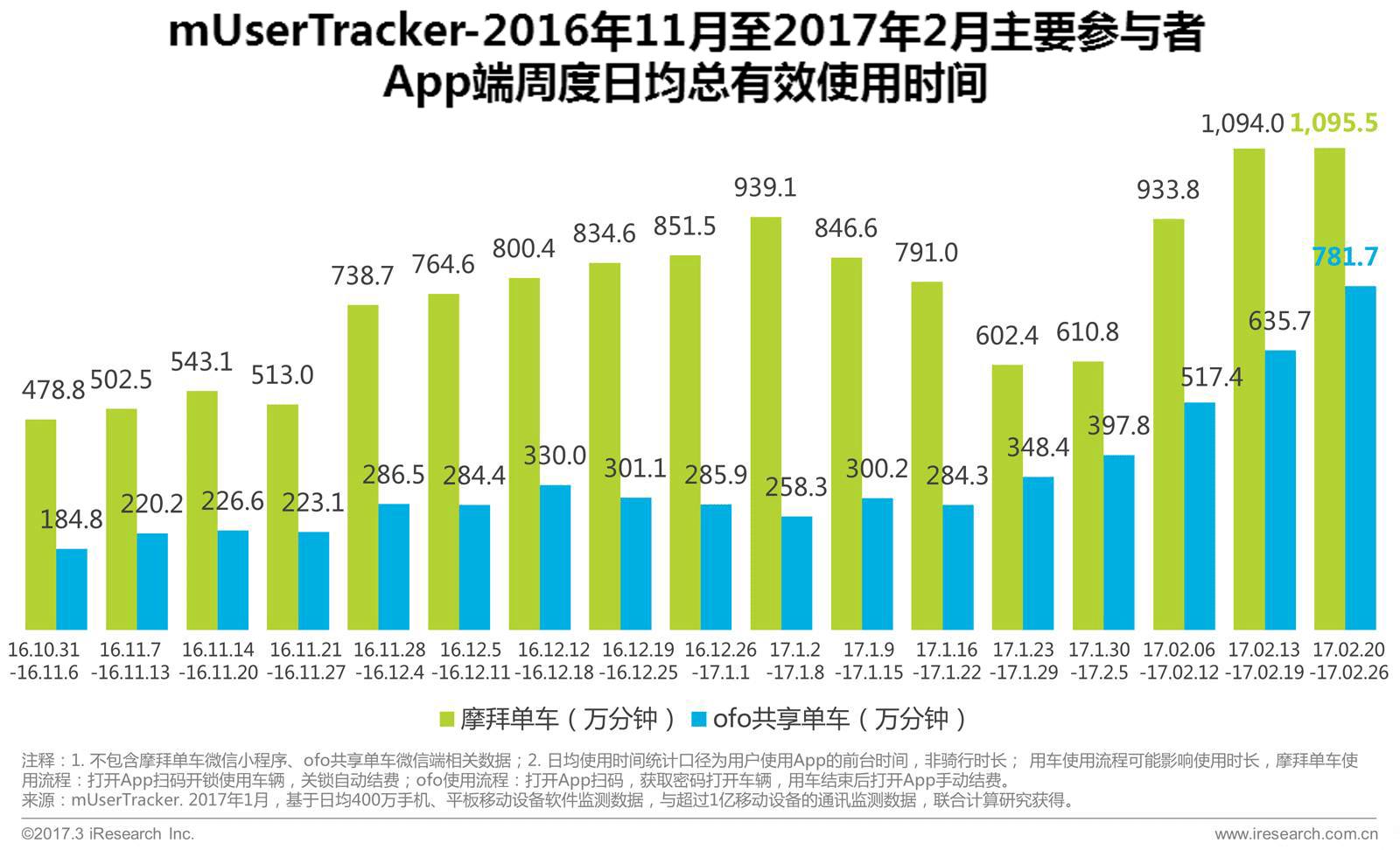 摩拜单车App日均使用时长由16年10月底478.8万分钟到2017年2月末,大幅增长至1095.5万分钟,相较10月底增长616.7万分钟,增长约2.3倍;ofo共享单车在2017年推出免费骑行日以及充值返现的营销活动,日均总有效使用时长在2017年2月末达到最高值,为781.7万分钟,相较10月底增长596.9万分钟,增长约4.2倍;从用户覆盖和日均使用时长来看,摩拜单车与ofo共享单车属于行业第一梯队。