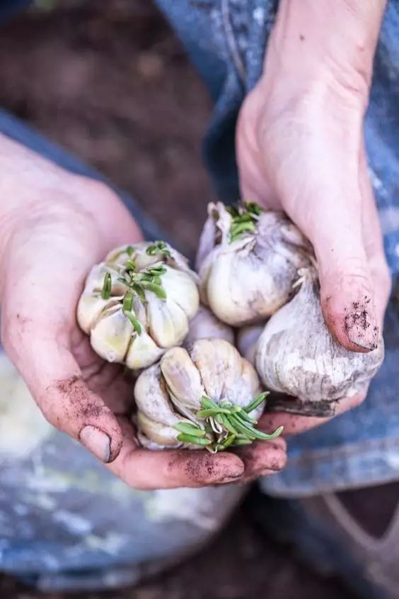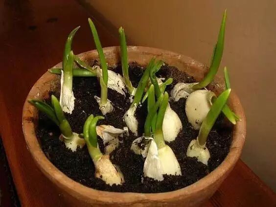 准备一些新鲜大蒜,掰成一个一个小瓣后,不要剥皮,把它们种到花盆里,让蒜瓣苗朝上喽出1/4,一个星期后就会出芽。